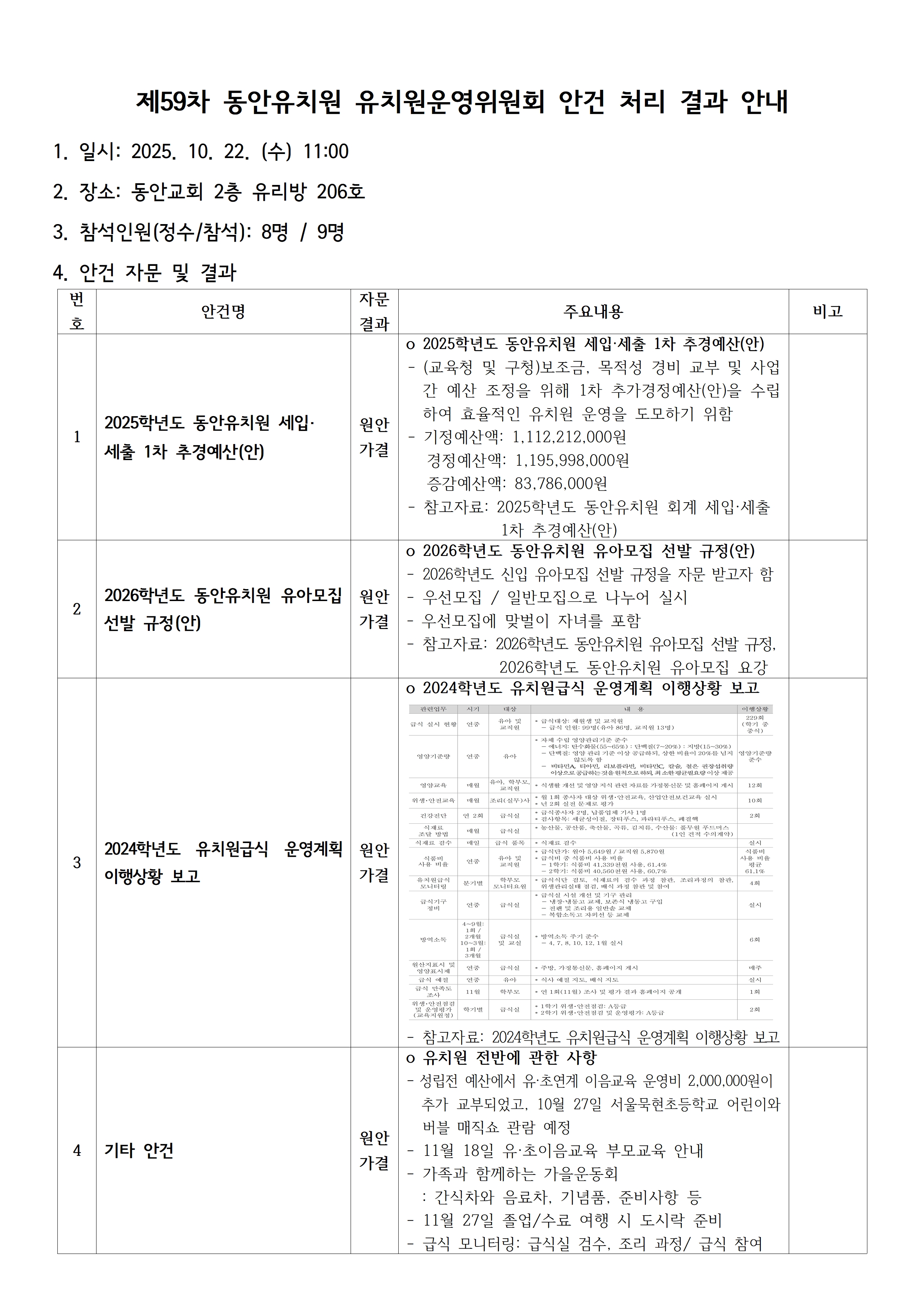 제59차 동안유치원 유치원운영위원회 안건 처리 결과를 안내합니다.