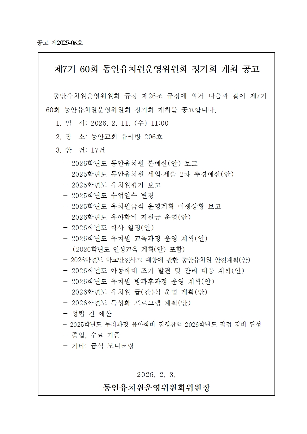 유치원운영위원회 제60회 정기회 소집 공고